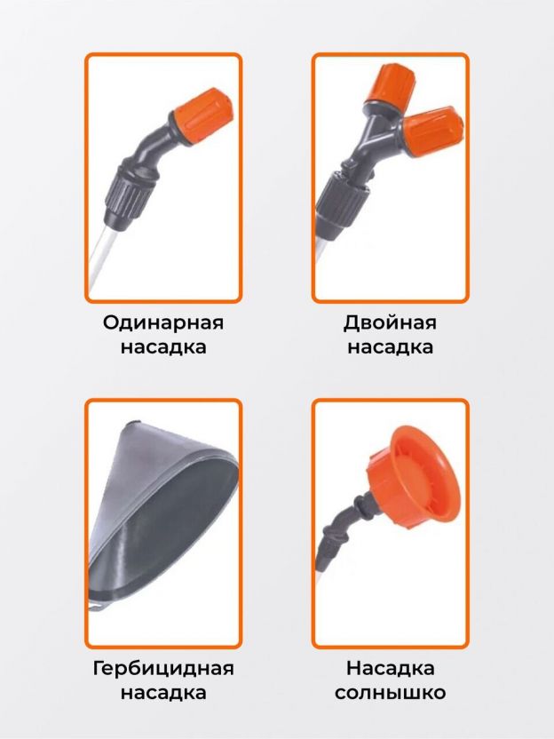 В комплект входят четыре насадки, предназначенные для разных задач. Благодаря этому вы можете выбрать оптимальный режим распыления для каждого типа растений. Это делает опрыскиватель универсальным инструментом для ухода за садом или огородом.