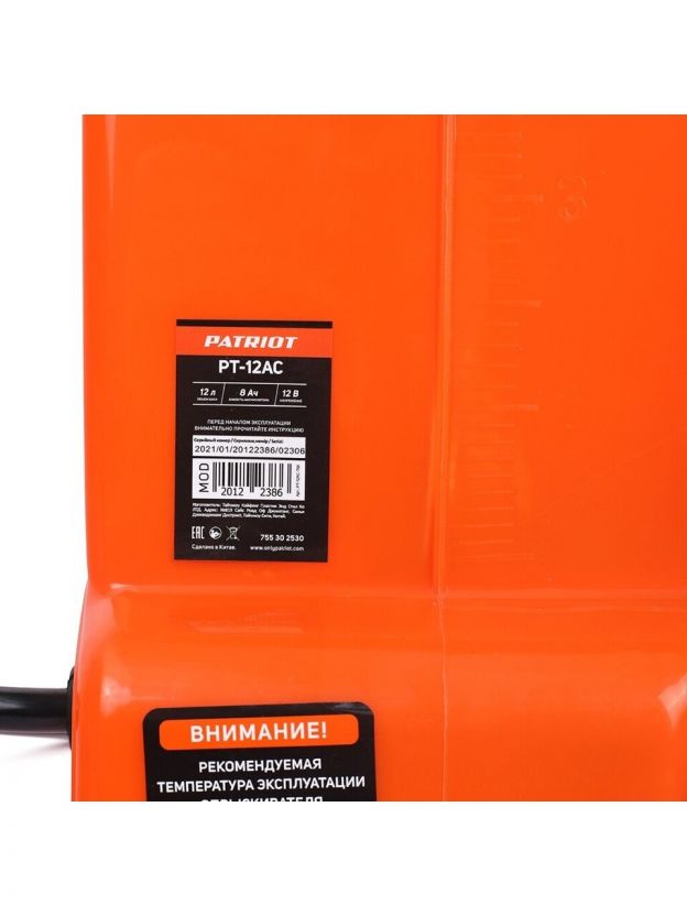 Опрыскиватель садовый аккумуляторный, Patriot, 12 л, свинцово-кислотный, 8 А.ч, 12 В, пластик, ранцевый, PT-12AC