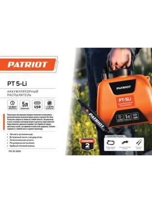 Опрыскиватель садовый аккумуляторный, Patriot, 5 л, Li-ion, 2.4 А.ч, 3.7 В, пластик, ранцевый, телескопическая штанга, 600 мм, PT-5Li