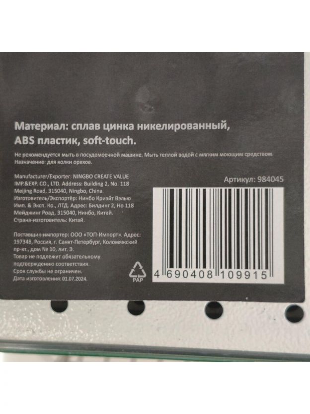 • Изготовлен из высококачественного цинкового сплава с никелированным покрытием. Орехокол не заржавеет даже если Вы возьмёте его в поход.