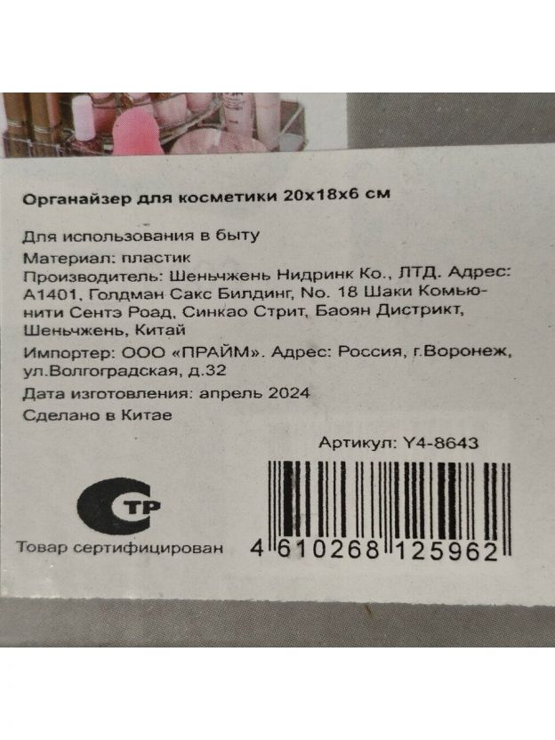 Выбирая органайзер для косметики Y4-8643, вы получаете не только практичное решение для хранения, но и эстетическое удовольствие от порядка и чистоты. Прозрачный и компактный, он станет идеальным дополнением вашего интерьера, позволяя с легкостью поддерживать порядок и быстро находить нужные косметические средства. Этот органайзер — идеальный выбор для тех, кто ценит удобство и стиль в деталях.