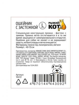 Ошейник с застежкой для животных Рыжий кот — надежный аксессуар для крупных питомцев. Благодаря прочному материалу полиэстер и регулируемому размеру 40-55 см, изделие обеспечивает комфорт и безопасность. Черный цвет гармонично сочетается с любой шерстью. Идеальный выбор для ежедневных прогулок и дрессировки.