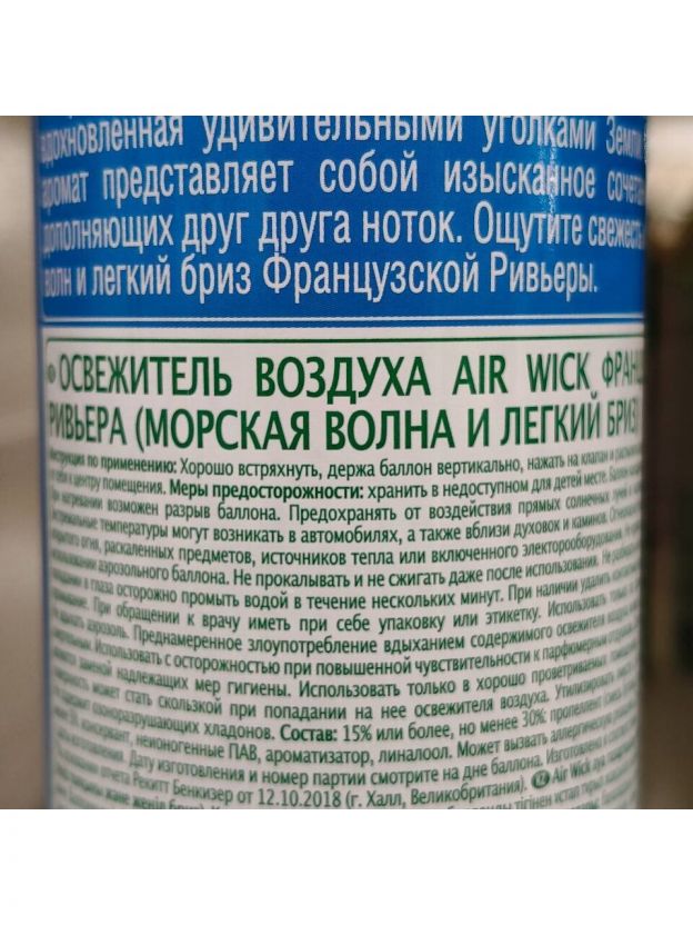 Аэрозоль-освежитель воздуха Air Wick Французская Ривьера из новой коллекции "Ароматы мира" эффективно борется с неприятными запахами, оставляя ощущение свежести морских волн и легкий бриз Французской Ривьеры.