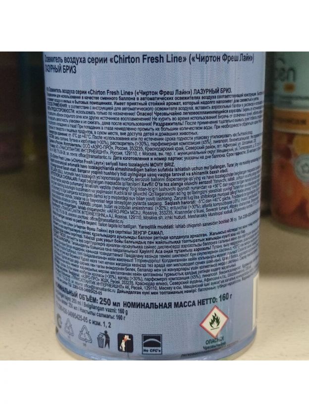 Освежитель воздуха Chirton, 250 мл, Fresh Line Лазурный Бриз, сменный, сухое распыление, 12,50