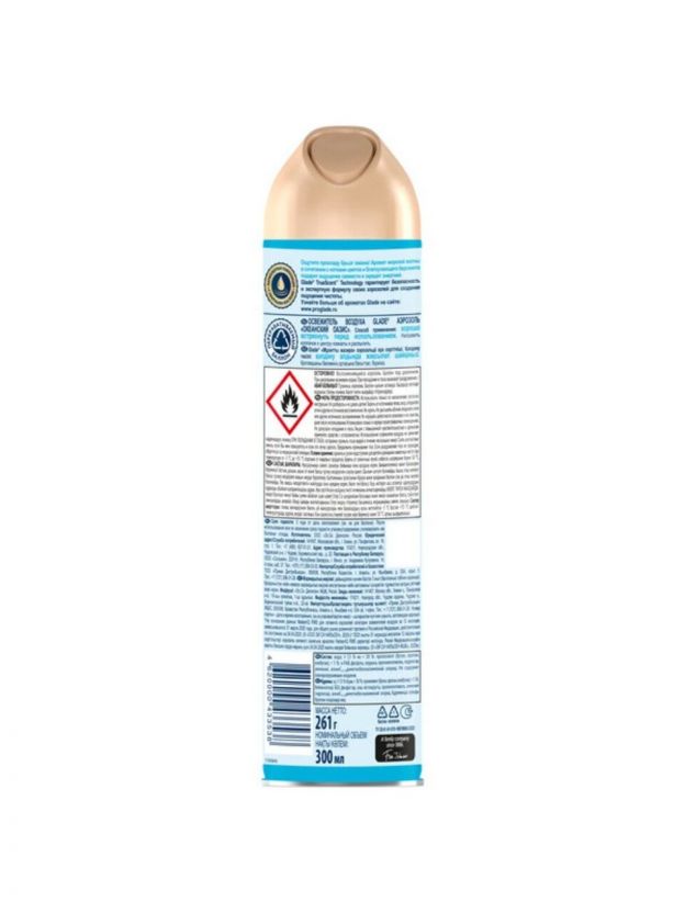 Glade Аэрозоль Океанский оазис устраняет неприятные запахи и мгновенно освежает воздух, наполняя его приятным ароматом. Перенеситесь на океанское побережье вместе с бодрящим ароматом морской волны в сочетании с нотками весеннего жасмина и благоухающего розмарина.
