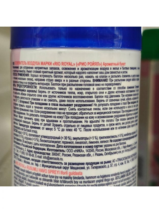 Освежитель воздуха Rio Royal «Ароматный букет» предназначен для устранения неприятных запахов в различных помещениях. Он надолго наполняет пространство приятным ароматом. Аэрозоль не содержит озоноразрушающих веществ. Способы применения: Хорошо встряхнуть баллон и нажатием на клапан в течение нескольких секунд распылить его содержимое вверх в центре помещения. Объем: 300 мл.