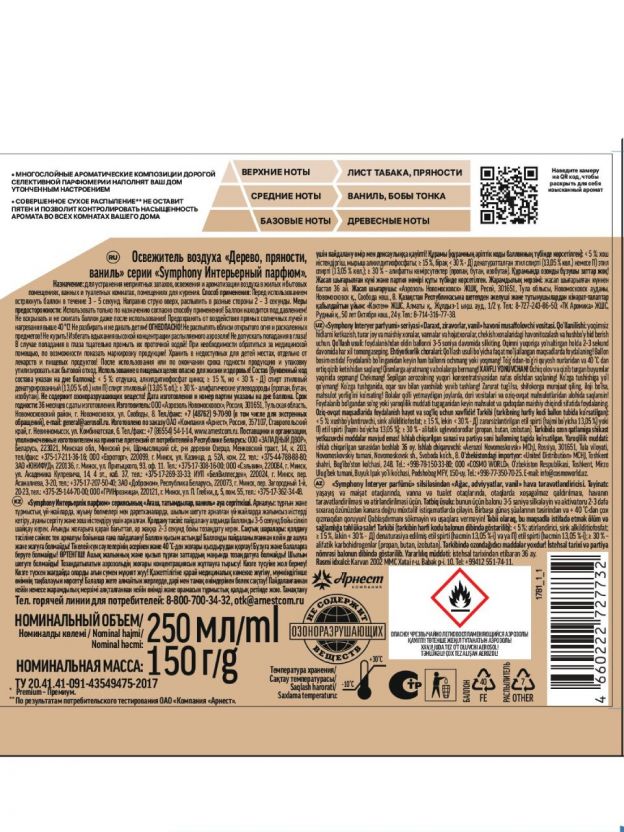 Освежитель воздуха Symphony 250 мл: стойкий аромат дерева, пряностей и ванили для уюта в доме и на даче. Устраняет запахи за 30 секунд. Почему выбирают: Уникальная композиция: сочетание древесных нот с пряностями и ванилью создает теплую атмосферу Удобный формат: компактный баллон 250 мл легко помещается в сумку, хватает на 120+ распылений Универсальность: подходит для квартиры, дачи, офиса, а также для подарка ценителям оригинальных ароматов Освежитель воздуха Symphony с ароматом дерева, пряностей и ванили — это быстрый способ нейтрализовать неприятные запахи и наполнить помещение гармонией. Благодаря натуральным эссенциям и современному распылителю средство равномерно распределяется по комнате и не оставляет следов на текстиле или мебели. Пользователи часто спрашивают: «Какой освежитель воздуха выбрать для дома?» — Symphony отлично подходит для жилых пространств, так как не содержит агрессивных химикатов и не вызывает раздражения. Если сравнивать с аналогами, данный освежитель отличается более стойким ароматом и экономичным расходом. Для тех, кто ищет, что лучше для дачи или офиса — Symphony обеспечивает до 8 часов свежести после одного применения. Как использовать освежитель воздуха? Просто встряхните баллон и распылите в центре комнаты или рядом с источником запаха. Ищете, подходит ли освежитель для кухни или санузла? Symphony эффективен даже в небольших помещениях, быстро устраняя запахи еды, табака или сырости. Его удобно брать с собой, а стильный дизайн делает средство удачным выбором для подарка. Оформите заказ сейчас — выгодная цена на освежитель воздуха Symphony, быстрая доставка и гарантия оригинального качества. Сделайте ваш дом уютнее уже сегодня. Частые вопросы: Как долго держится аромат освежителя Symphony 250 мл? Средство обеспечивает стойкий аромат до 8 часов после одного распыления. Объем 250 мл рассчитан на более 120 применений. Подходит ли этот освежитель для аллергиков и семей с детьми? В составе нет агрессивных компонентов, запах мягкий и не вызывает раздражения — подходит для использования в детских и жилых комнатах. Какие размеры и расход у баллона? Объем баллона — 250 мл. Компактная форма позволяет брать его с собой, а одного флакона хватает на длительный срок даже при ежедневном использовании.