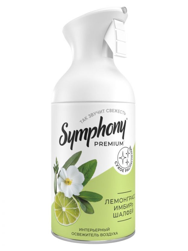 Освежитель воздуха Symphony 250 мл с ароматом лемонграсса, имбиря и шалфея: свежесть и комфорт для дома за 1 минуту. Эффективное устранение запахов, натуральные экстракты, экономичный расход.