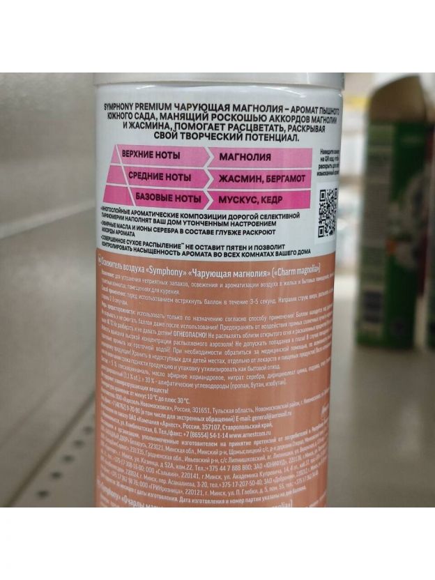 Освежители воздуха «Symphony» – лучшая возможность создать уют и придать индивидуальность Вашему дому. Загадочный цветочный аромат переносит в неведомую реальность, где пышное цветение весенней магнолии наполняет воздух благоухающей свежестью Аромат от французских парфюмеров Сухое распыление Яркий эмоциональный дизайн Объем 300 мл.