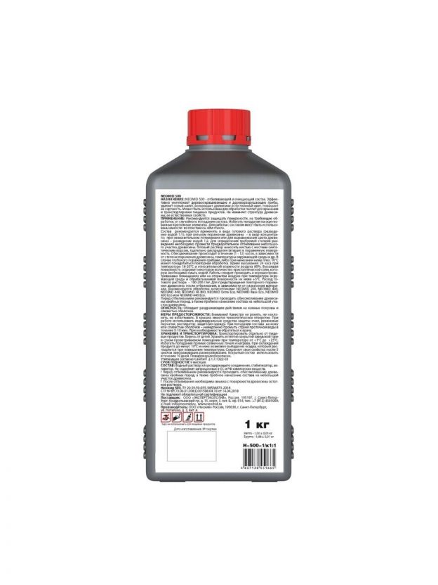 Neomid 500 — отбеливающий и очищающий состав. Эффективно уничтожает деревоокрашивающие и дереворазрушающие грибы, удаляет серый налет, возвращает древесине естественный цвет, повышает ее сортность. Может быть использован для обработки паллет для хранения и транспортировки пищевых продуктов. Не изменяет структуру древесины, ее естественных свойств.