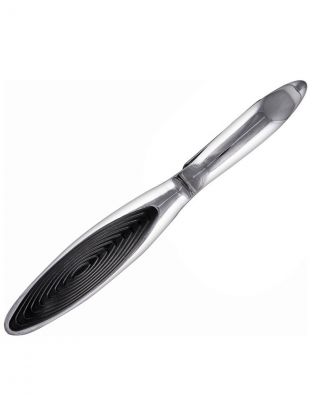 Лезвие из нержавеющей стали дольше остаётся острым, прорезиненная рукоятка предотвращает скольжение, вертикальная конструкция обеспечивает быструю и аккуратную чистку без лишних усилий.