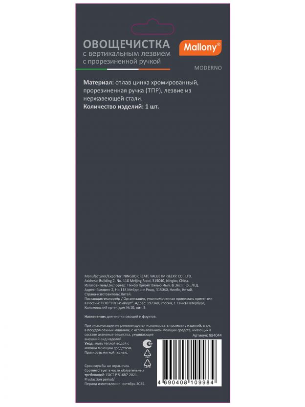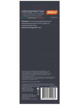 Овощечистка нержавеющая сталь, 17х2.3 см, вертикальное лезвие, прорезиненная рукоятка, Mallony, Moderno, 984044