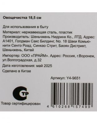 Длина овощечистки — 18.5 см, рукоятка выполнена из прочного пластика, цвет — чёрный. Лезвие — из нержавеющей стали.