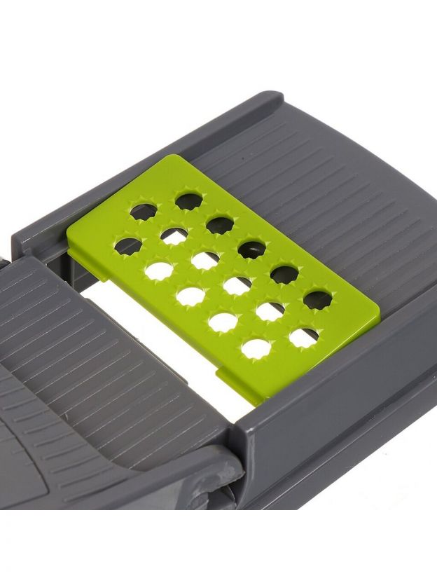 Терка - овощерезка быстро и качественно нашинкует овощи и фрукты разнообразными способами! Она разработана совместно с профессиональными шеф-поварами, а это значит, что в ее конструкции учтены все необходимые качества для быстрой и легкой нарезки. Нарезанные продукты будут попадать в специальный контейнер, который оснащен резиновыми накладками, что не позволит ему скользить по рабочей поверхности. Для протекции ваших рук разработан универсальный держатель, который сохранит ваши пальцы в безопасности. Так же в комплекте вы найдете специальную вилку для удаления застрявших кусочков в прессе и удобный контейнер для сушки овощей и фруктов. Овощерезка выполнена из высококачественного ABS пластика, а острые лезвия с лазерной заточкой - из нержавеющей стали. Терка сделает за вас самую сложную работу на кухне, сэкономит время и превратит каждое блюдо в настоящее произведение искусства.