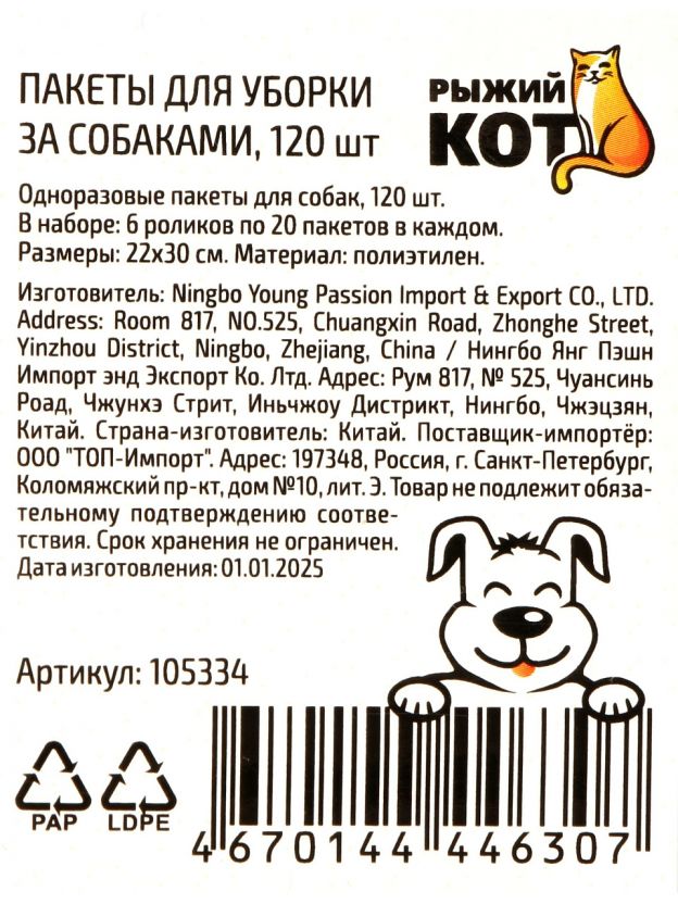 Пакеты изготовлены из плотного полиэтилена, в упаковке 120 шт. Производство — Китай, бренд Рыжий кот.