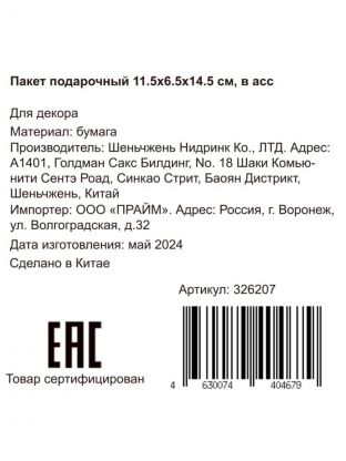 Пакет подарочный бумага, 12х6.5х14.5 см, в ассортименте, голографический, Y6-2465