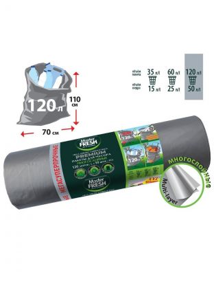 Пакеты для мусора 120 л, 10 шт, 60 мкм, прочные, Master Fresh, серые