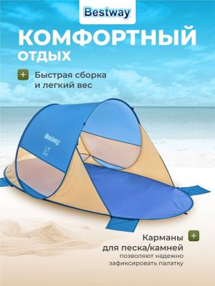 Отпуск на побережье – это прекрасно. С помощью пляжной палатки можно создать уютную индивидуальную зону на пляже, укрыться от небольшого дождя или палящего солнца, защититься от насекомых. С этими задачами отлично справится палатка Bestway Beach Quick 2. В ней могут комфортно разместиться два взрослых человека. Изделие легко собирается и разбирается. В комплект поставки входят палатка и сумка для переноски.
