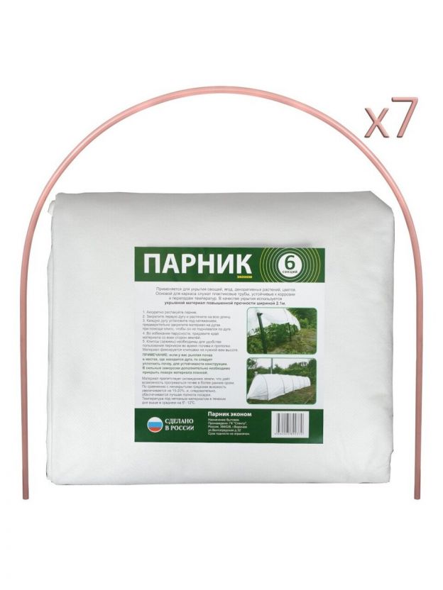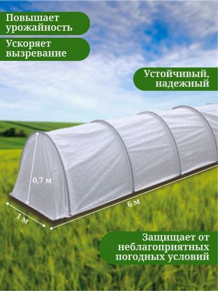 Парник обладает шириной 1 метр, длиной 6 метров и высотой 0.7 метра, что делает его достаточно просторным для размещения большого количества растений. Материал покрытия — спанбонд с плотностью 42 г/м2 — обеспечивает хорошую вентиляцию и защиту от ультрафиолетовых лучей, поддерживая необходимый уровень влажности и температуры внутри парника. Каркас из пластика с дугами длиной 2.5 метра и диаметром трубы 16 мм гарантирует прочность и устойчивость конструкции.