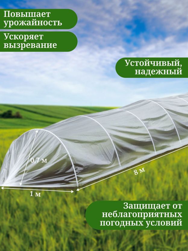 Парник 1х8х0.7 м, полиэтилен, дуга 2.5 м, пластик, парниковая пленка 80 мкм, с клипсами