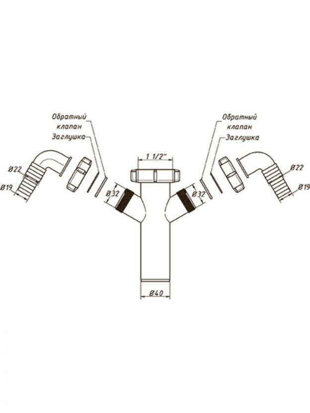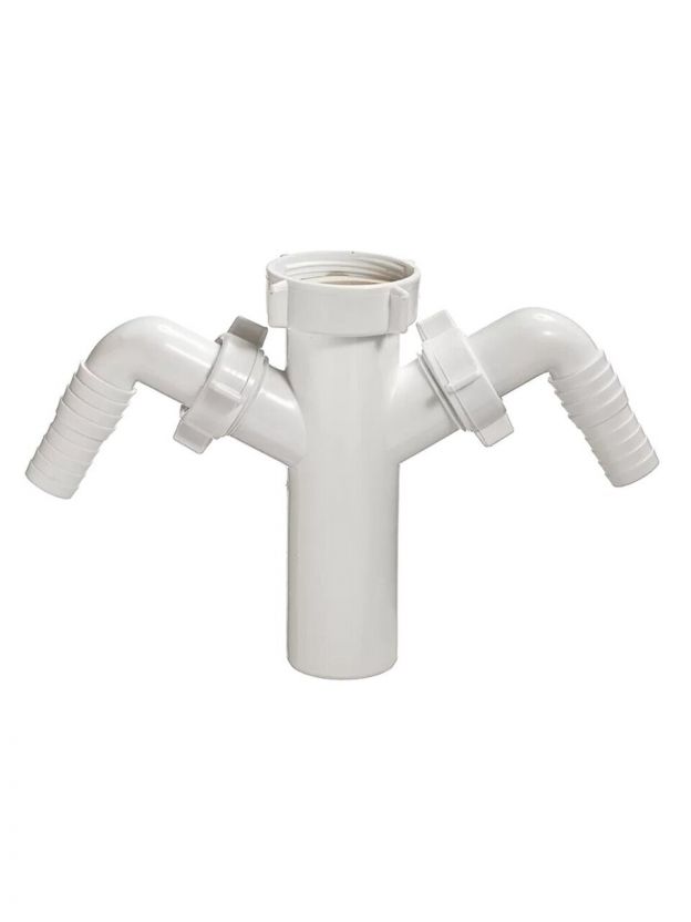 • Пластиковый патрубок для сифона имеет два отвода для подключения слива от стиральной и/или посудомоечной машины;