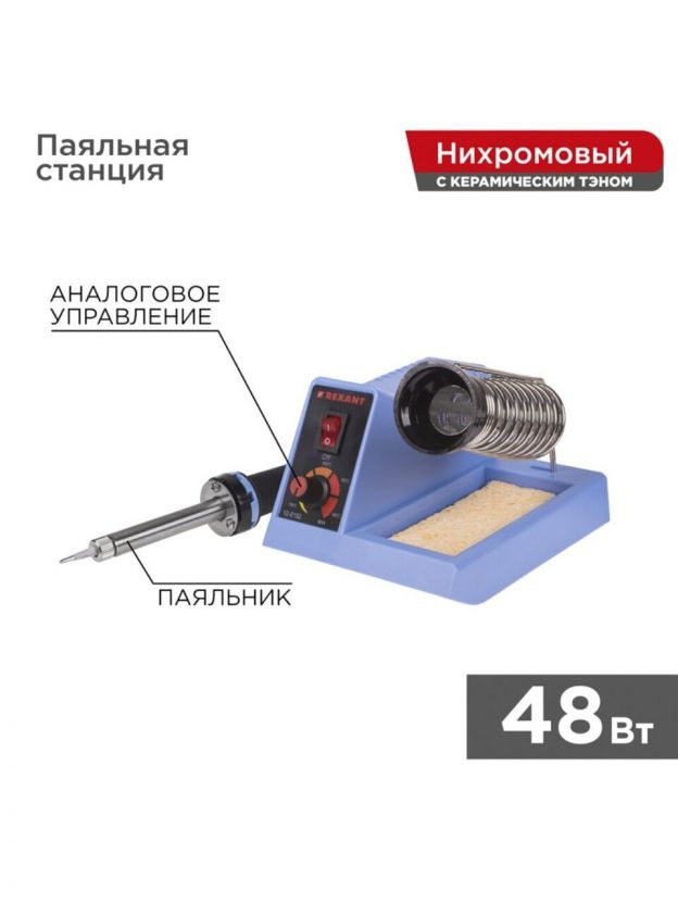 Паяльная станция сетевая Rexant 12-0152 — надежное и эффективное решение для пайки и ремонта электроники, радиодеталей и мелких бытовых устройств. Мощность 48 Вт и широкий диапазон рабочих температур 160-480°C позволяют выполнять как тонкие, так и более сложные работы, обеспечивая аккуратный и качественный результат. Благодаря сменному жалу и удобной пластиковой рукоятке работа становится комфортной даже при длительном использовании.
