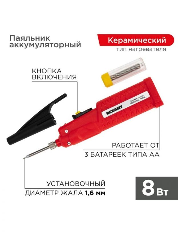 Паяльник на батарейках, 8 Вт, 4.5 В, рукоятка пластик, от 3 батареек АА, Rexant, Mini, 12-0181