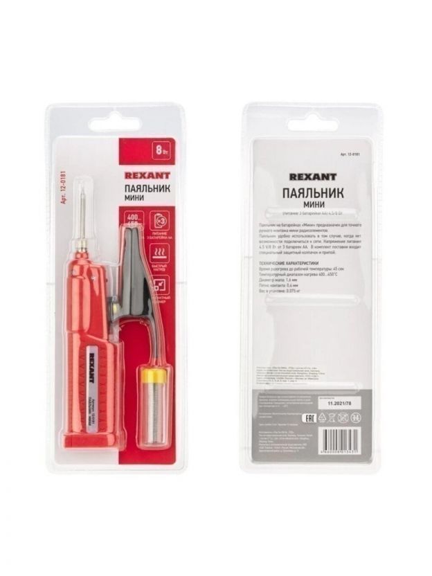 Паяльник REXANT 8 Вт, 4,5 В с керамическим нагревателем – компактное и эффективное решение для мелких ремонтных работ, творчества и электроники. Mini-формат и питание от 3 батареек типа АА делают его незаменимым инструментом для домашних мастеров, любителей радиотехники и тех, кто ценит мобильность и удобство в работе. Благодаря современному керамическому нагревателю обеспечивается быстрый и равномерный нагрев, что позволяет экономить время и получать качественный результат даже при работе с деликатными деталями. Портативность и легкость конструкции позволяют легко брать инструмент с собой на дачу или использовать в условиях, где нет доступа к электросети. Паяльник REXANT 12-01 станет надежным помощником для тех, кто ценит функциональность, безопасность и простоту эксплуатации.