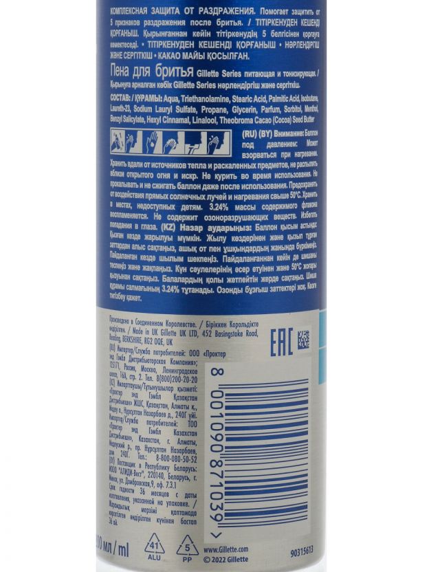 Пена для бритья Gillette Series для чувствительной кожи: гладкое бритьё без раздражения, питание и тонизирование кожи, экономичный объём 200 мл. Почему выбирают: Уникальная формула Gillette Series — защита и забота о чувствительной коже, минимизация покраснений и сухости Объём 200 мл — надолго хватает, удобно брать с собой, оптимально для ежедневного использования Универсальное решение — подходит для дома, путешествий, подарка мужчине с любым типом кожи Пена для бритья Gillette Series, питающая и тонизирующая, специально разработана для чувствительной кожи. Благодаря мягкой текстуре и активным компонентам, она обеспечивает комфортное скольжение бритвы, предотвращает появление микропорезов и раздражения. Если вы ищете, какую пену для бритья выбрать для чувствительной кожи, обратите внимание на этот продукт — он сочетает в себе уход и защиту, востребованные в современных трендах мужской косметики. По сравнению с аналогами, пена Gillette Series быстро вспенивается, создаёт плотный защитный слой и легко смывается водой, не оставляя липкости. В отличие от обычных пен, формула содержит питательные и тонизирующие ингредиенты, которые уменьшают сухость после бритья. Часто спрашивают: подходит ли эта пена для ежедневного использования? Да, она безопасна для частого применения и не содержит агрессивных добавок. Как использовать: нанесите небольшое количество на влажную кожу, равномерно распределите, побрейтесь и смойте водой. Оформите заказ на пену для бритья Gillette Series прямо сейчас — получите оригинальный продукт с быстрой доставкой и гарантией свежести. Экономьте на уходе за кожей без потери качества! Частые вопросы: Какой объём у пены для бритья Gillette Series, питающей и тонизирующей? Объём флакона — 200 мл. Этого хватает на несколько месяцев регулярного использования, особенно если наносить средство тонким слоем. Чем выгодно использовать пену Gillette Series для чувствительной кожи? Пена уменьшает раздражения и покраснения, обеспечивает лёгкое скольжение бритвы и дополнительно питает кожу. Это особенно важно для мужчин с чувствительной кожей, склонной к сухости. Подходит ли эта пена для подарка? Да, благодаря универсальному назначению и стильной упаковке пену Gillette Series часто выбирают в качестве практичного подарка для мужчин любого возраста.
