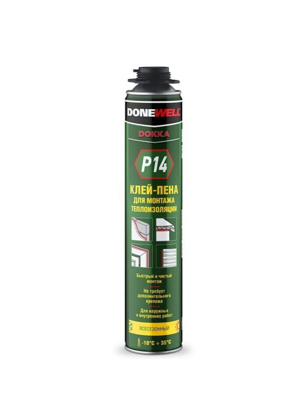 Однокомпонентный полиуретановый вспенивающийся клей DoneWell Р14 предназначен для быстрой и эффективной фиксации теплоизоляционных плит в системах СФТК и ETICS.