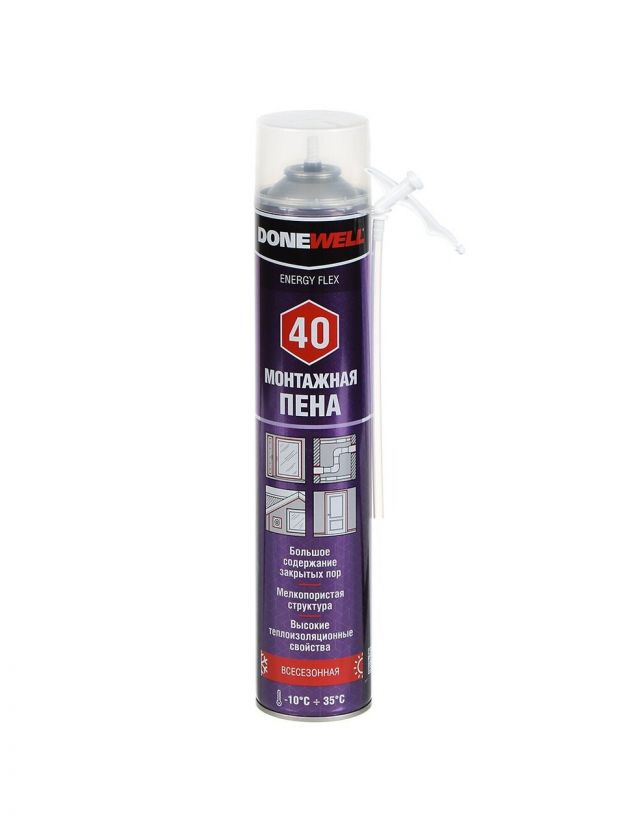 Полностью отверждённая бытовая монтажная пена DONEWELL ENERGY FLEX 40, благодаря повышенной гидрофобности поверхностного слоя и большого содержания закрытых пор, значительно снижает проникновение влажного воздуха через монтажный шов, тем самым сохраняет высокие теплоизоляционные показатели шва в различных климатических условиях, что сокращает эксплуатационные расходы по отоплению зданий.