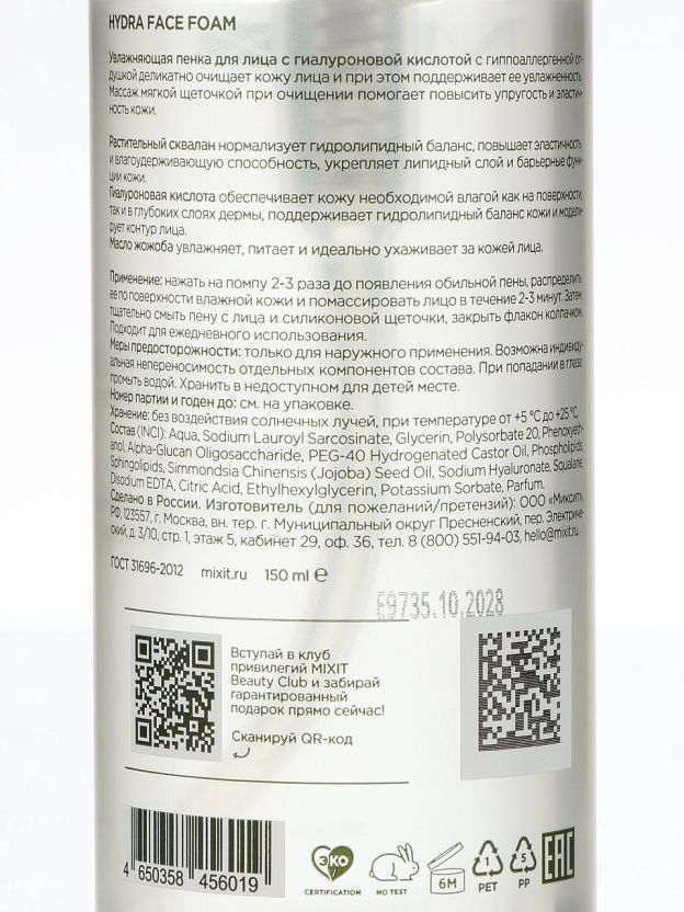 Пенка для лица Mixit Hydra: глубокое увлажнение и свежесть кожи с гиалуроновой кислотой — результат уже после первого применения, объем 150 мл.