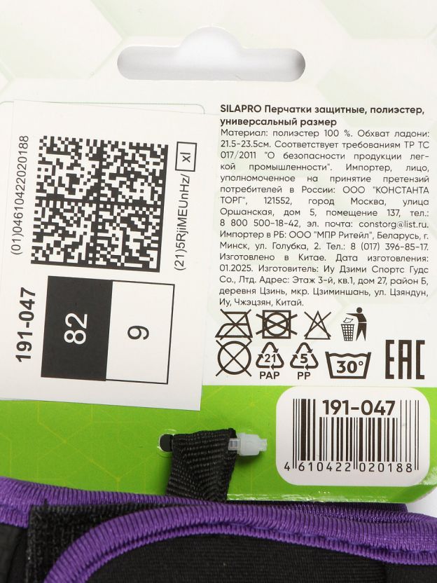 Перчатки защитные, универсальный размер, полиэстер, обхват ладони 21.5-23.5 см, в ассортименте, SilaPro, 191-047