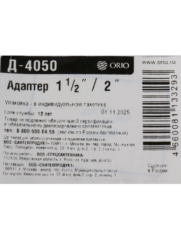 Переходник для сифона, полипропилен, 1"1/2х2" г-ш, Orio, Nordform, Д-4050