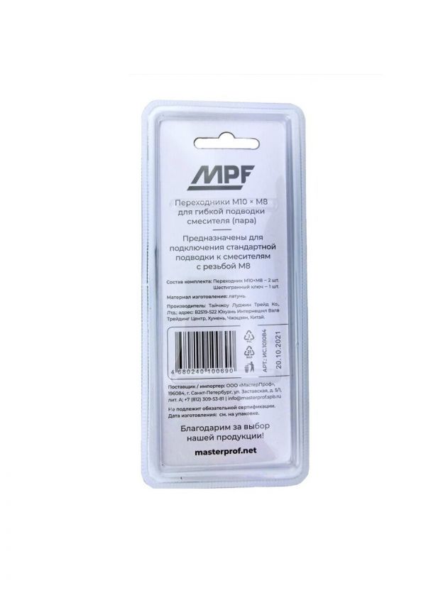 Переходники подводки для воды М10-М8, пара, шестигранный ключ, латунь, MasterProf