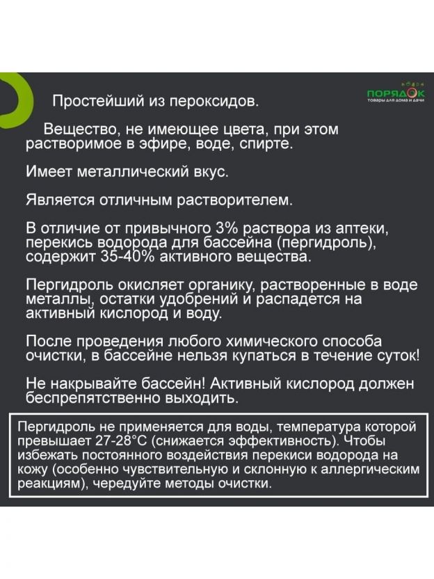 В отличие от привычного 3% раствора из аптеки, перекись водорода для бассейна (пергидроль), содержит 35-40% активного вещества.