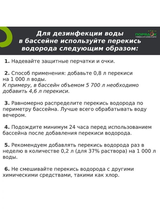 Перекись водорода для бассейнов – это идеальная альтернатива хлорсодержащим средствам. Без хлора, оно обеспечивает мягкую и безопасную дезинфекцию, что особенно важно для людей с чувствительной кожей и аллергиями. Средство подходит для регулярного использования, позволяя повторять очистку по мере необходимости и строго следить за концентрацией перекиси водорода.