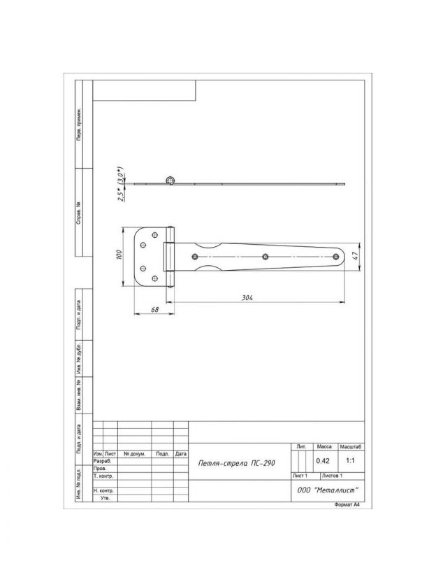 Петля-стрела для деревянных дверей, Кунгур, 290 мм, универсальная, ПС-290, 10421, оцинкованная