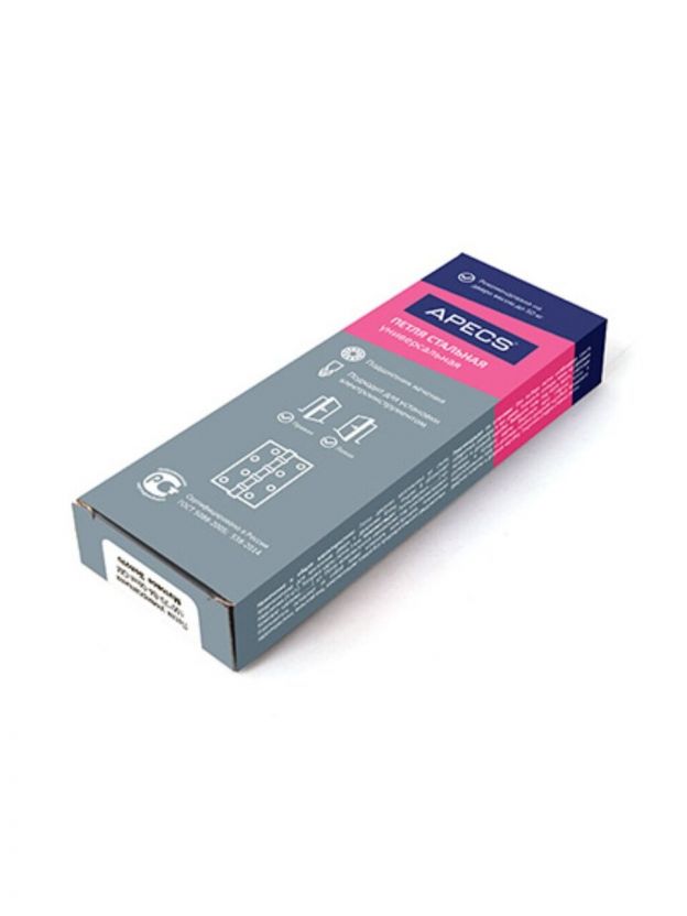 Разъемные врезные петли Apecs - одно из самых качественных предложений на рынке стальных петель. Предназначены для деревянных межкомнатных дверей. Петли Apecs прошли испытания в России и сертифицированы согласно ГОСТ 5088-2005. Укомплектованы подшипниками качения, обеспечивающими плавность хода и долгий ресурс службы. Закаленные саморезы позволяют использовать электроинструмент при установке. Характеристики: Материал: сталь; Цвет: черный матовый; Тип упаковки: коробка; Ширина: 70 мм; Высота: 100 мм; Толщина карты: 3 мм; Покрытие: гальваника; Тип установки: накладной / разъемный / с врезкой; Форма карты петли: прямоугольная; Тип петли: карточный; Установка: универсальная. Рекомендации по установке петель в зависимости от веса дверного полотна: Максимальный вес двери на 2 петли: 50 кг; Максимальный вес двери на 3 петли: 60 кг.
