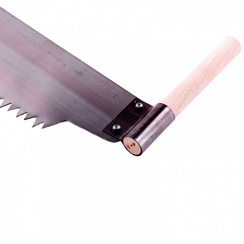 Двуручная пила — это инструмент со множеством зубьев для поперечной распиловки круглых лесоматериалов, брусьев, толстых досок. Выполняется в виде металлической пластины, на рабочей кромке которой расположены зубья, а по бокам — две ручки.