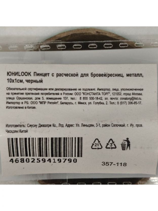 Пинцет для бровей и ресниц, металл, 10х1 см, с расческой, ЮниLook, 357-118
