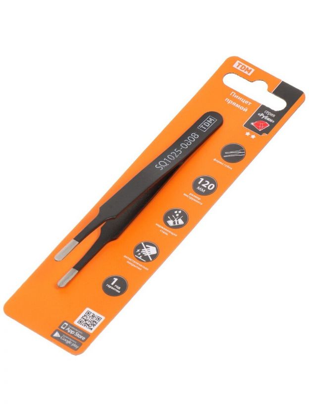 Пинцет прямой, рукоятка нержавеющая сталь, плоское жало 3 мм, актистатическое покрытие, TDM Electric, Рубин, 120 мм, SQ1025-0808