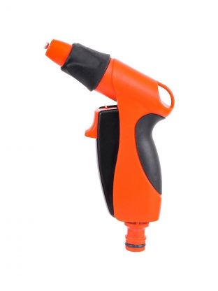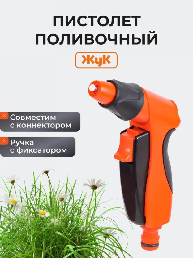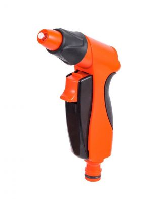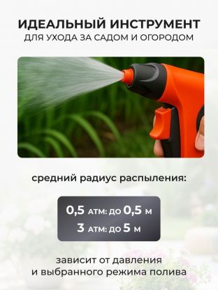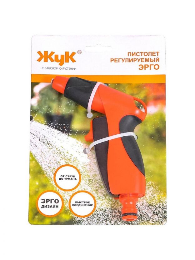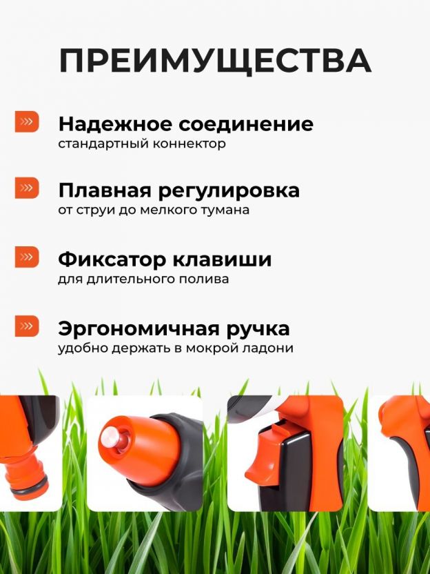 Пистолет позволяет плавно регулировать интенсивность распыла от струи до тумана. Эргономичная рукоятка удобно ложится в ладонь, а фиксатор рабочего положения клавиши позволяет с удобством выполнять полив газона или садовых культур.