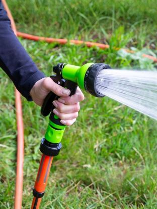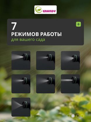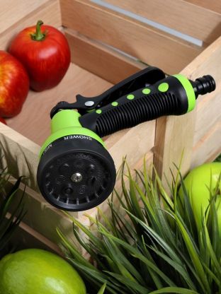 Пистолет-распылитель используется для полива растений. Имеет 7 различных режимов пуска струи (душ, режим задействования всех отверстий, мелкий туман, плоско-вертикальная струя, плоско-горизонтальная струя, туман, жесткая струя).