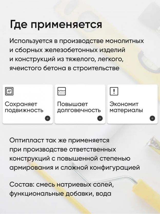 Добавка Оптипласт используется в производстве монолитных и сборных железобетонных изделий и конструкций из тяжелого, легкого, ячеистого бетона в строительстве различного назначения: гражданском, промышленном, транспортном, дорожном и т.д., в том числе при изготовлении изделий и конструкций систем питьевого водоснабжения. Оптипласт применяется при производстве ответственных конструкций с повышенной степенью армирования и сложной конфигурацией.