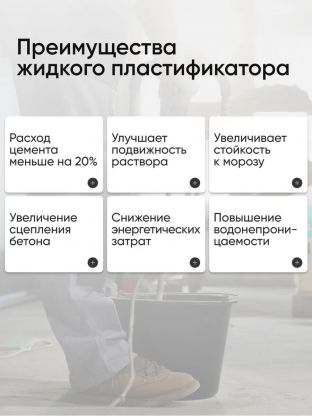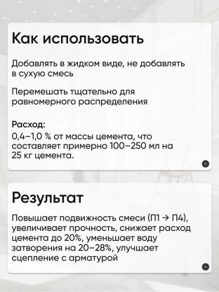 Расход. 150-200 мл на 1 мешок (25 кг) строительной цементно-песчаной смеси; 1,5-2,5 л на 100 кг цемента.