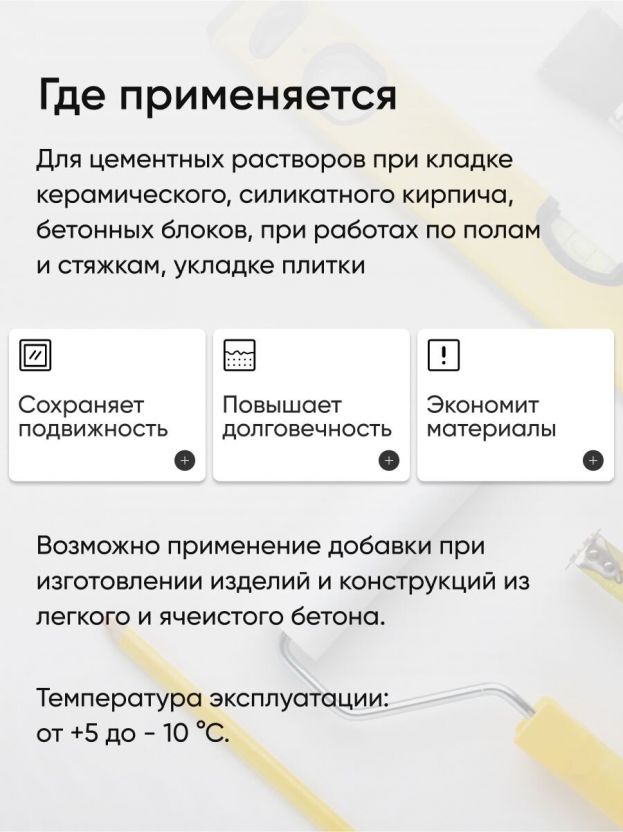 • Высокий воздухововлекающий эффект (более 10% об.) позволяет увеличивать объем цементной растворной смеси и таким образом экономить материалы.