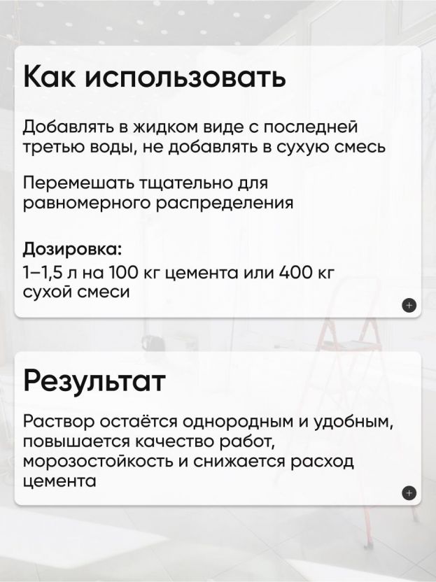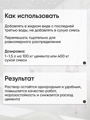 Рекомендуемая дозировка добавки составляет 1-1,5 л на 100 кг цемента или на 400 кг сухой смеси.