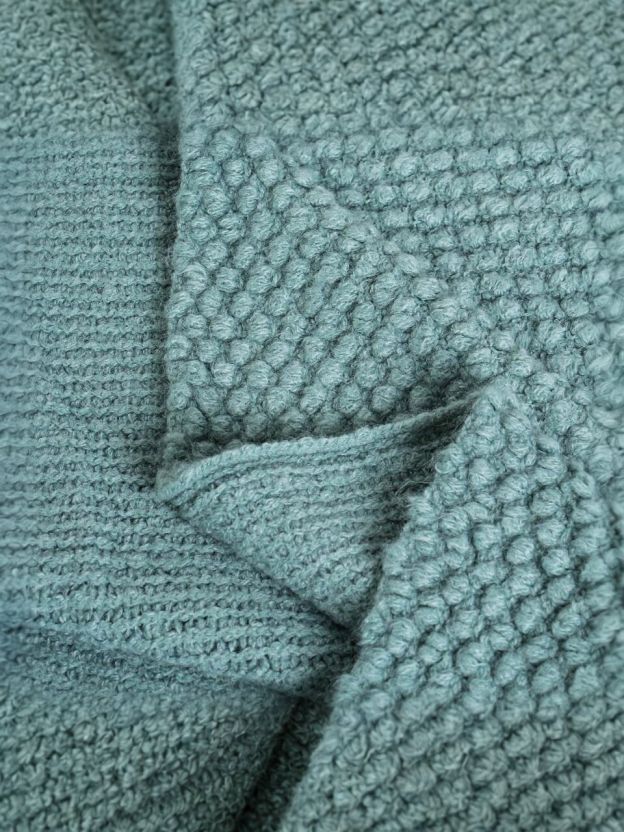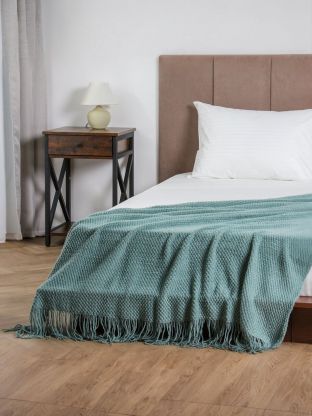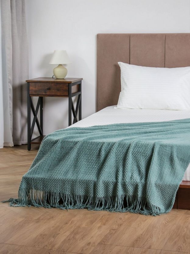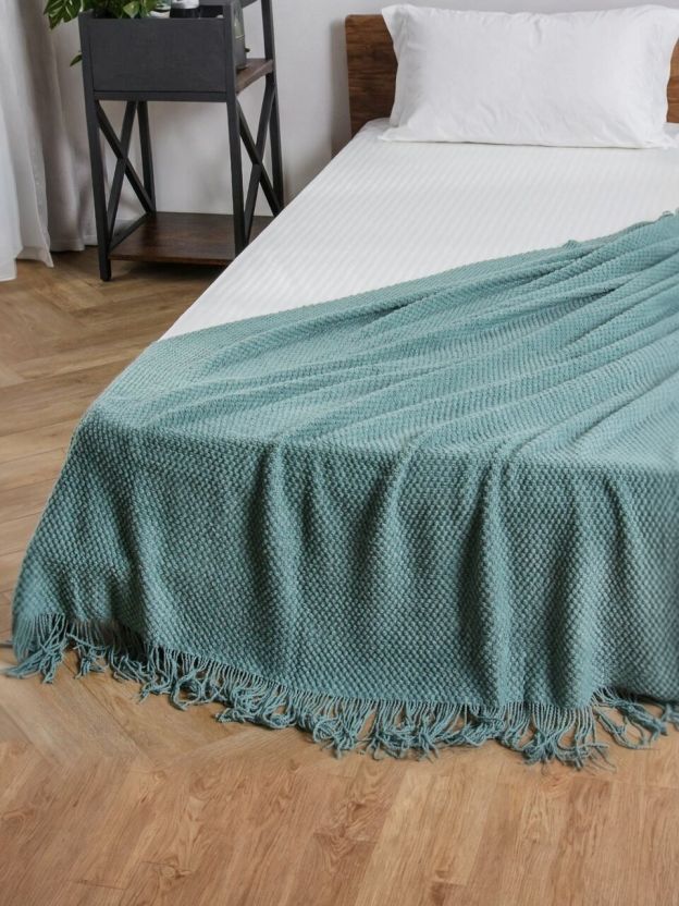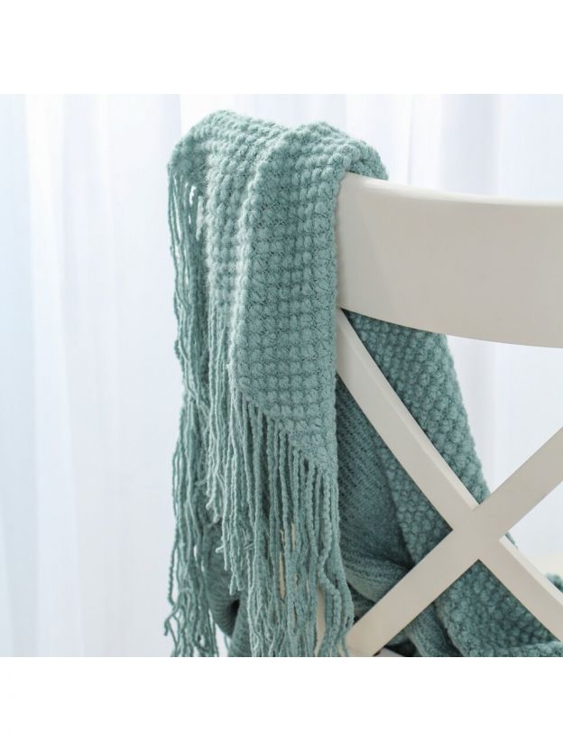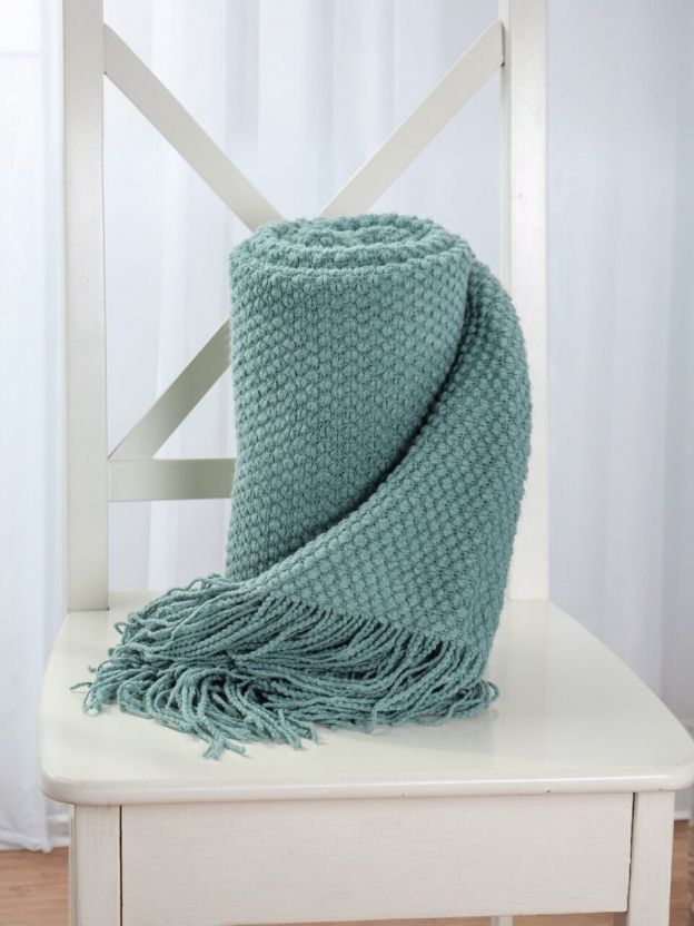 • Уникальный дизайн: вязаный плед с бахромой в модном серо-голубом оттенке, легко впишется в любой интерьер.