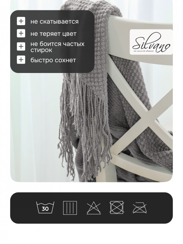 Рекомендуется машинная стирка при 30–40°C, плед быстро сохнет и сохраняет форму. Не требует глажки, не скатывается и не линяет.
